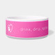 The design has a sleek 'drink, drip, splash' theme, symbolising the joy of pet ownership. The background features a cool, modern gradient that ranges from light to medium pink. Whether they're eating their dog food or drinking water, this durable, high-quality dish makes a delightful pet accessory for any home. It's a thoughtful dog mum or dog dad gift for birthdays, holidays, or any special day.