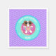 These custom birthday party napkins feature Sophie, a brown and white cartoon dog, relaxing on a inflatable pool float in the shape of a doughnut. Sophie is wearing sun glasses and is wearing a pink swimsuit with a pineapple design on it. Party napkins have a wavy pattern and sparkles as accents. The party plate has tones of aqua blue, purple, bright pink, white and mint green.