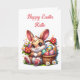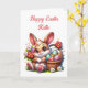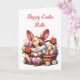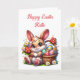 Cute Easter bunny card with bonus colouring page on the inside. Adorable whimsical Easter bunny, eggs and basket card for children. Add name in the personalise area.