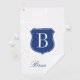 Personalised elegant name monogram logo blue and white golf towel. Monogrammed golfing gifts for men and women. Stylish script typography template for name and initial letter. Luxury Birthday gift ideas for golfer, husband, dad, father, friend, co worker, boss, colleague, coach, instructor, trainer, teacher, grandpa, retired person etc. Add your own surname or funny quote. Including hook to hang it up. Unique golf accessories for friends and family. Classy shield emblem design. Customisable colours.