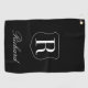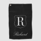 Personalised elegant name monogram logo black golf towel. Monogrammed golfing gifts for men and women. Stylish script typography template for name and initial letter. Luxury Birthday gift ideas for golfer, husband, dad, father, friend, co worker, boss, colleague, coach, instructor, trainer, teacher, grandpa, retired person etc. Add your own surname or funny quote. Including hook to hang it up. Unique golf accessories for friends and family. Classy shield emblem design. Customisable colours.