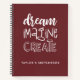 This personalised girly 8.5 x 11 sketchbook has white text on a maroon red background. The words, "DREAM,IMAGINE,CREATE" in a hand drawn font personalised with your name below. Customise the sketchbook with the name of your choice to make someone feel extra special. Makes a fun gift for birthdays or for Christmas. Comes in a variety of colours. Designed for you by Blackberry Boulevard.