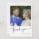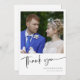 Elevate your wedding thank you with our exquisite "Personalised Elegant Wedding Thank You Card". This stunning card features a beautiful, hand-lettered "Thank You" in elegant script, adding a touch of sophistication to your heartfelt message. The front of the card showcases a custom, polaroid-style photo, perfectly capturing the joy and love of your special day. Personalise the card further by adding your names, special date, and wedding location, making it a treasured keepsake that tells your unique love story. The back of the card features a black custom message of gratitude, beautifully merging script and modern typography against a pristine white background. This thoughtful design captures your appreciation with elegance and charm, making it the perfect way to express gratitude to cherished guests or loved ones. Order our "Personalised Elegant Wedding Thank You Card" and make your thank you truly unforgettable.