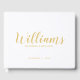featuring last name in gold modern script with bride and groom's name and wedding date in gold modern sans serif font style.