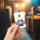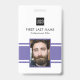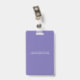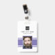Personalised business office ID badge featuring a purple and white background, a photo of the employee, your company logo, name and profession.