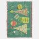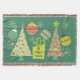 Pretty personalised Everything Christmas throw blanket with a background of teal with cream snowflakes, two decorated Christmas trees with stars on top, four pretty holiday ball ornaments, and a green package with ribbon and an area you can customise with your family name!