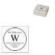 This custom address stamp features a circle frame. A large sample initial is placed in the centre below a sample family name. You can personalise the stamp to include your own initial, family name, or business name. The address is printed in the bottom portion in a sophisticated but simple font.