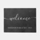 Elegant personalised family name doormat featuring your family name with your established date set in a classic white text on a chalkboard background with the message "welcome" that is set in an elegant white script text. Designed by Thisisnotme©