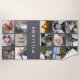 Display fifteen favourite photos or vacation memories on this uniquely printed personalised beach towel, featuring a gridded layout and square photos on a classic grey background. Perfect for your Instagram snaps, towel features 15 photo templates with your family name or choice of personalisation in modern script lettering.
