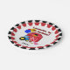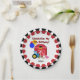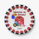 Personalised Farm 5th Birthday paper plates, cute and colourful, great for the farm or farm animal theme birthday celebration! These farm theme fifth birthday paper plates feature outside decorative rings of black, yellow,and red with a red hay barn, pig, chicken, blue farm tractor, birthday balloons, text that reads Celebrating My 5th Birthday, and an area you can add the birthday child's name!