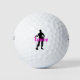 Personalised female golfer golf balls. Black silhouette of a female golfer with a golf club by her side and personalised with your name across the front in pink. You can customise further by changing the font and colour in the design tool edit section when personalising.