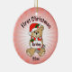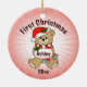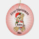 A sweet female teddy bear on a red starburst background with customisable name & date on front and back. Font and colour of text can also be changed.