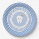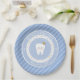 Personalised First Tooth party decorations. Baby blue paper plate with cute tooth, editable name and date. Visit the shop to see all the First Tooth collection.