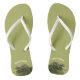 Do you someone who needs a pair of personalised flip flops with photos of frogs on them? Well, you're in luck because these are the perfect pair. They feature a photo of a frog perched on a green moss-covered rock set against an avocado green background with your name or other text in bold white lettering.