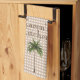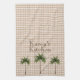 Dress up anyone's kitchen with three tall green palm trees. The background is light gingham checks and the kitchen towel is personalised with your name set in dark brown trendy font above the towering trees.