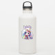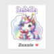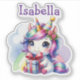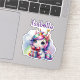 Cute little girl's name personalised party sticker with an adorable cartoon rainbow unicorn with a birthday hat on holding a gift with a rainbow in the background.