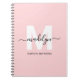 Personalised Elegant Modern Blush Pink Script Name Initial Monogram Spiral Notebook. This simple and girly notebook features a soft blush pink background with a clean white initial that pairs beautifully with a hand-lettered black script name. Below the initial, the full first and last name is printed in a sleek, modern font, creating a polished and feminine look.