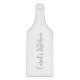 Personalised glass cutting board with handle. Add your own custom name or quote. Elegant gift idea for chef, cook, mum, wife, dad, father, etc. Handy cooking supplies for kitchen or restaurant. Paddle shape with script typography. Special Birthday or Christmas gift ideas.