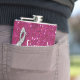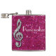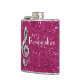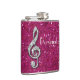 Personalised elegant glamourous girly hip flask which you can personalise with your own name. Beautiful, dazzling trendy printed image silver and diamonds bling jewels musical note on a chic hot pink sparkly glitter printed image background. A cute, classy, fashionable, stylish, pretty gift for her or any music lover.