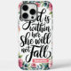God is Within Her : Psalm 46:5 Christian iPhone case. A watercolor floral border in soft pinks and purples surrounds elegant gold script that reads “God Is Within Her, She Will Not Fall". personalised with name.