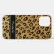 Personalised faux gold glitter leopard print iPhone 12 case. Luxurious golden background texture with elegant script typography text for custom name or monogram. Chic animal spots design with fake glimmering shiny sparkles. Luxury style gift idea for stylish women and teen girls. Glittery look and exotic pattern.