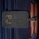 Personalised Black Leather Luggage Tag features a gold monogram and name. It is a perfect unique wedding luggage tag with a classic and elegant masculine style.
