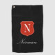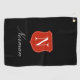 Personalised gold towel gift with classy logo. Custom golfing gift for men and women. Red shield emblem with name initial.