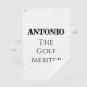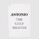 You'll just love this funny personalised golf towel! Two types of black text on a white towel. The funny quote is "(NAME) THE GOLF MEISTER"
