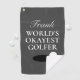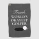 Funny custom golf towel for world's okayest golfer. Personalised present for him or her. Unique golfing gifts for men and women. Elegant script typography template for name or monogram letters. Fun Birthday gift ideas for golfer, husband, dad, father, friend, co worker, boss, colleague, coach, instructor, trainer, teacher, grandpa, retired person, golf lover, instructor etc. Add your own surname or funny quote. Including hook to hang it up on your trolley. Unique golf accessories for friends and family.