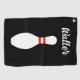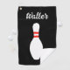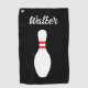 Personalised golf towel with bowling pin design. Custom name with classic white bowling pin drawing.