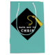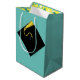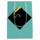 Creative graduation gift bag featuring creative black and gold cap design on teal blue background. To personalise edit text to add name of grad.