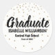 Tiny gold glitter stars cascade down this round white sticker. Graduate is written in a large modern script font. The graduate's name is written in simple block capital letters. The school and graduation year follow. Very sophisticated and modern design. Easy to personalise. It will look fabulous on graduation announcements, invitations, and thank you notes.