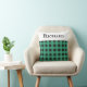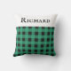 A stylish throw pillow for a bed, chair or sofa, patterned with a classic buffalo plaid design in green and black. At the top is a white band, with your chosen name in black capital lettering. The buffalo check cushion makes an attractive and useful gift for friends, family and colleagues, at Christmas and all year round.