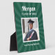 Modern and minimal plaque display sign with easel for the graduation party will showcase your graduate! Design features a square photo of the grad framed in white with simple and classic first name, class year, and school name wording that can be personalised. Includes a subtle starburst pattern. Dark green background colour can be modified to coordinate with school or party colours. Makes a beautiful keepsake to display in your home.