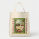 Handy tote bag for Easter Eggs, Gardening Tools, etc. features an original digital painting by Leslie Sigal Javorek of a whimsical scene through a mossy-green framed floral shop window of violets planted in a ceramic bunny planter. Flanked by 3 custom text fields that default to "Spring Has Sprung!!".
