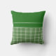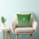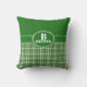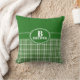 This custom throw pillow has a dark green background on top and a plaid and green pattern on the bottom. In the centre, there monogram logo with can be customised with your initial and last name.
