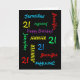 What a wonderful, personalised greeting card for a 21st birthday or any other occasion. On the cover, Name and Age repeats in different fonts and colours on a black background. Easy to personalise - just CHANGE NAME, AGE, and OCCASION in ONE PLACE. Supports name up to 9 characters. A colourful and fun Birthday CARD. Kids, teenagers, and adults will love it! Also easy to modify inside text, if desired. All Rights Reserved © 2014 Marcia Socolik.