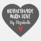 A personalised "homemade with love" sticker on a heart shaped, grey coloured background. Make it yours by adding your own name. A pretty finishing touch for all of your handmade gifts. Designed for you by Blackberry Boulevard.