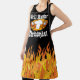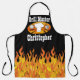 Personalised Grill Master BBQ Apron. Add his name or title. Black apron features cool flames image patter and grill utensils spatula, fork and chef's hat against a background of orange and red flames. Great fun and creative father's day gift for the man who loves grilling outside on the barbecue in the summer. Great gift idea for husband, boyfriend, dad, grandpa or anyone who loves to cook and be chef.
