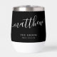 Personalised Groom Elegant Black White Script Calligraphy Name Thermal Wine Tumbler. Easy to customise elegant script typography. Perfect wedding party or bridal party accessory gift idea!