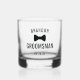 Custom wedding attendant whiskey glass featuring the title 'GROOMSMAN", a bow tie, the date, and their name.