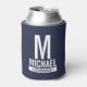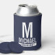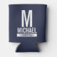 This design features personalised groomsman's monogram, name and title in white modern bold sans serif font style on navy blue background.