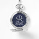 featuring personalised monogram in white elegant script font style with groomsman's name and title in classic serif font style on navy blue background.