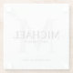 This coaster features personalised groomsman's name with title and wedding date in grey and monogram in light grey as background, in classic serif font style, on white background.