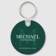 This keychain features personalised groomsman's name with title and wedding date in white and monogram in light emerald green as background, in classic serif font style, on emerald green background.