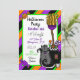 Black cat and witches boot and broom Personalised Halloween invitations. Purple, orange, lime green and black detailing with cute candy embellishments.