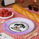 Happy Birthday paper plates with purple and black anime girl eating pizza.