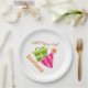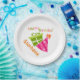 Happy birthday personalised paper plates and birthday party goods featuring a picture of a pink party hat and a green gift wrapped package with green and pink coloured lettering wishing a Happy Birthday.