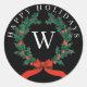 Personalised Happy Holidays Black Monogram Wreath Classic Round Sticker