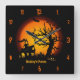Add your name. Haunted House Halloween wall clock with tree silhouette and huge moon in the background.